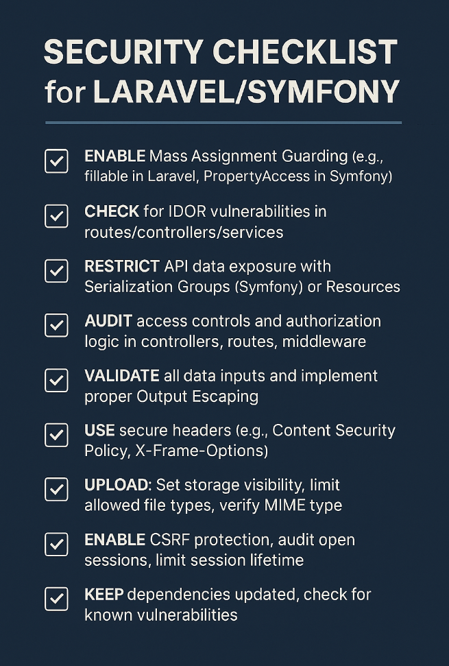 Warto sprawdzić konfigurację serwera, uprawnienia do plików, ustawienia session / cookies, limity uploadu, nagłówki HTTP, aktualność pakietów Composer/Bundles — bo to częste źródła luk. Automatyczne skanery nie zawsze analizują konfigurację środowiska, a framework (Laravel/Symfony) daje dużą elastyczność, co może prowadzić do błędów przy ręcznych modyfikacjach.